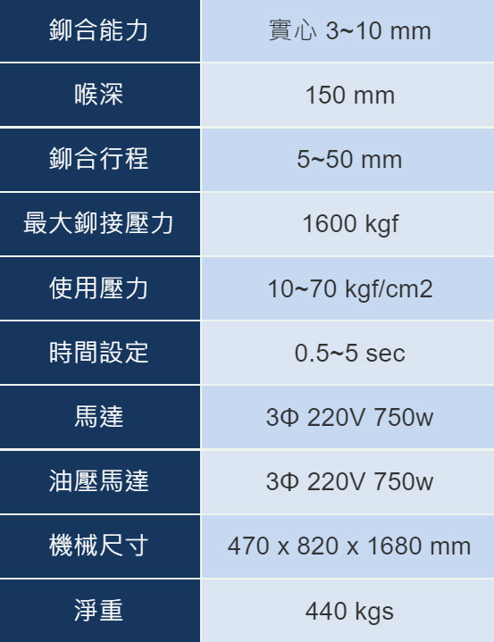 ✔ 鉚合動力使用油壓系統,可提供穩定且大的鉚合能力